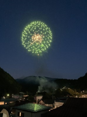祭りの夜には、花火が打ち上げられました。山あい特有の地形からくる反響音とともに、美しい花火を至近距離で楽しむことができました。これは初めての体験で、夜空に咲く大輪の花火とその響きが忘れられない思い出となりました。