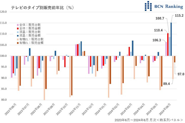 テレビの販売が回復し始めた。この6月、2020年3月以来4年3カ月ぶりに、販売金額前年比が2桁増の110.4%を記録。円安に伴うインフレで平均単価が上昇しているのが一因だ。しかし、販売台数も106.3%と増加してきた。このところマイナス基調で推移していたテレビ市場に明かりが見え始めている。全国2400店舗の家電量販店やネットショップなどの実売データを集計するBCNランキングで明らかになった。