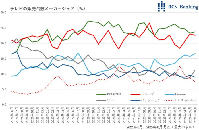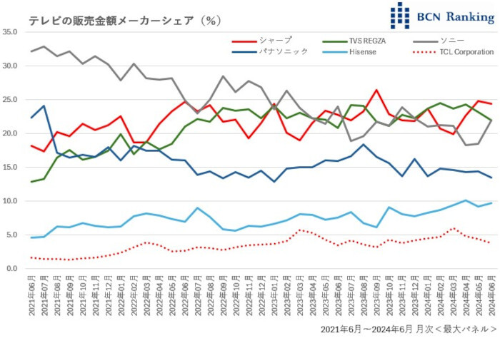 コロナ禍以降、テレビ市場の勢力図は大きく変化した。この6月の販売台数トップは、シェア23.8%でTVS REGZAだった。2位がシャープで22.6%。し烈なトップシェア争いが繰り広げられている。3位につけているのが中国メーカーHisense。16.7%までジリジリとシェアを上げてきた。TVS REGZAの親会社でもある同社は、価格の安さを武器に勢力を拡大している。以下、ソニー、パナソニックが10%前後という状況だ。3年前の21年6月に目を転じると、台数シェア21.1%で1位のシャープに、2位ソニーが20.1%で絡む展開。翌7月にはソニーが21.5%でトップシェアを獲得する場面もあった。パナソニックも東京オリンピック特需を背景に16.5%を記録。上位陣に名を連ねていた。
