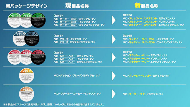 ブリティッシュ・アメリカン・タバコ・ジャパン(BATジャパン)は、オーラルたばこ「VELO(ベロ)」の全11銘柄のパッケージデザインと10銘柄の製品名称を刷新し、7月22日から順次リニューアル販売している。
