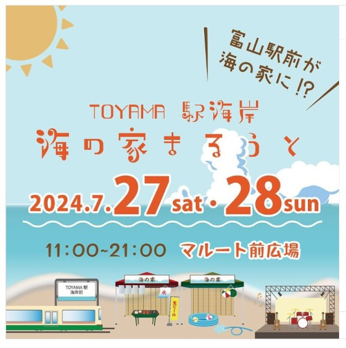 「TOYAMA駅海岸 海の家まるうと」は、「昔ながら」をテーマとした海の家が富山駅前に登場し、子どもから大人まで非日常の空間で楽しめるよう、毎年7月末に開催されている。水をテーマとした遊び、浜焼きやお酒、かき氷といった涼を楽しめる海の家、懐かしい往年の名曲が楽しめるライブという三つのコンテンツで構成されており、年齢に関係なく誰もが気軽に楽しめる。