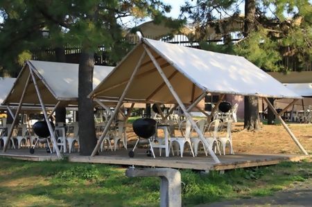 TENT(テント)は、極上のグランピング体験ができるバーベキュースペースが完備された宿泊施設だ。1棟ごとに独立しており、人目を気にせずプライベート時間を満喫できる。また、施設内にはコンシェルジュも常駐。施設に関することはもちろん、観光スポット情報なども気軽に質問できる点は魅力だ。