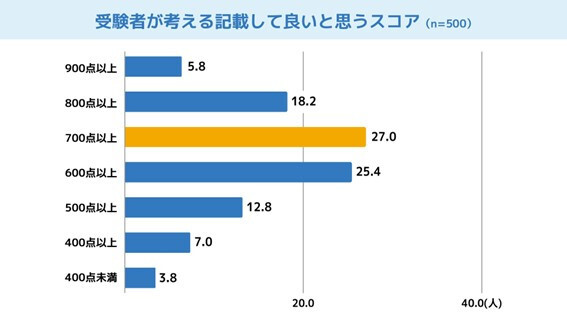 2022年の調査では、「『履歴書・職務経歴書・社内のプロフィール等に記載してもいい』と思う『TOEIC L&R』のスコア」を求職者に聞いたところ、「700点以上」と答えた人が最多となりました。一方で、採用を担当する人事側に「実際に評価するスコア」を尋ねたところ、中央値は「600点以上」となり、応募する側と評価する側で100点ほどの開きがありました。つまり、企業では高得点獲得者への評価はもちろんのことですが、中級者~上級者に入り始めたくらいのスコアからでも評価されているともいえる結果となったのです。