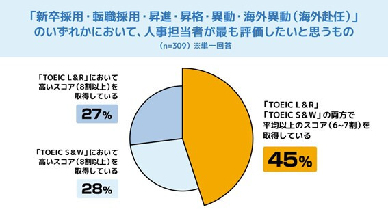 「英語力」にもListening、Readingといったインプットの技能と、Speaking、Writingのようなアウトプットの技能を合わせて「英語4技能」と呼び、これらの技能をバランスよく身につけていることが望ましいといえます。また、ビジネスにおいては、シチュエーションに応じたコミュニケーションや、相手の文化背景に合わせて、知識としての英語を使いこなせるかといった点も重要になります。実際、調査でも「人事担当者が最も評価したいもの」を聞いたところ、「『TOEIC L&R』において高いスコア(8割以上)を取得している」が27%だったのに対して、「『TOEIC L&R』『TOEIC S&W』の両方で平均以上(6割~7割)のスコアを取得している」が45%と、4技能全体でスコアを持っていることが評価されるという結果も見られました。TOEIC S&Wはそれぞれ0~200点となっています。TOEIC Program DATA & ANALYSIS 2024からTOEIC S&W公開テスト受験者の平均スコアがSpeaking約130点、Writing約140点のため、まずはこの辺りを目指すと良いと思います。