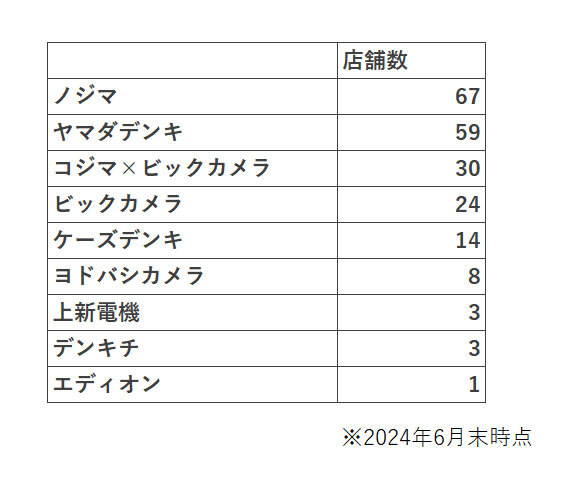 ※本記事の「家電量販店」の総数は、家電量販店各社のウェブサイトに2024年6月末時点で記載されていたデータをもとに独自に集計したものです。7月以降の新規開店・閉店は反映しておりません。