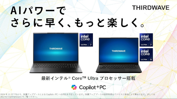 サードウェーブのAI PC新製品「THIRDWAVE F-14LN7LA」「THIRDWAVE F-14LN5LA」「THIRDWAVE DX-L7LA」の発売が9月24日に決定した。