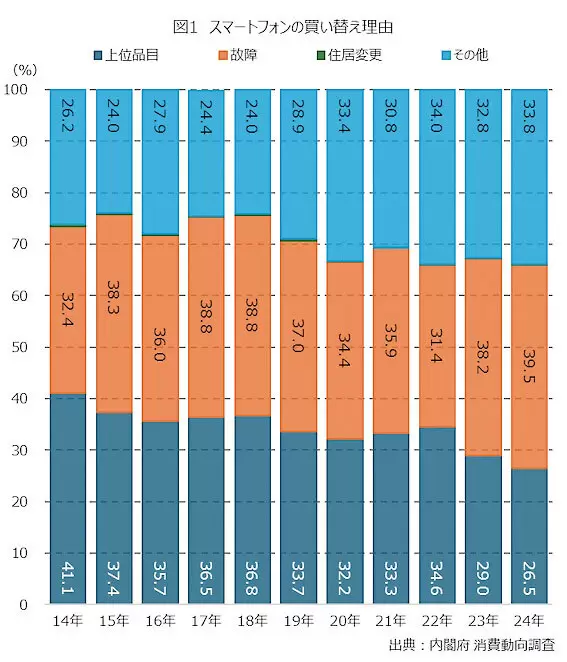 内閣府の消費動向調査の結果を使って、携帯電話の買い替え理由をみていく。なお、消費動向調査においては、継続的な調査であるため、携帯電話と表記されているが、ほぼスマートフォンと考えて良いだろう。