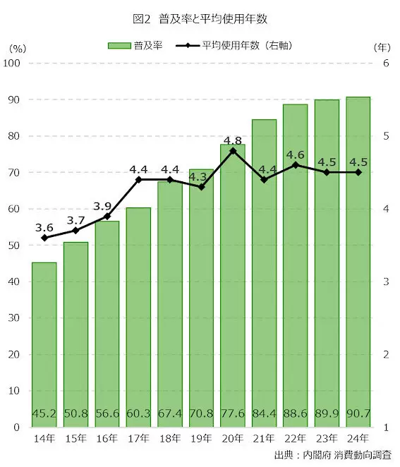 次に、普及率と平均使用年数の関係をみる。14年の普及率は45.2%と半数に届いていなかったが、年を追うごとに比率は上昇。19年には7割を超え、24年にはついに9割に到達した。
