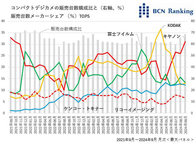 カメラといえば、今やレンズ交換型のミラーレス全盛だ。しかし、折からの円安とインフレで平均単価はドンドン上昇。ボディーとレンズをセットで買えば100万円超え、という製品も珍しくなくなってきた。いくらスマートフォン(スマホ)との差別化を図るためとはいっても、レンズ交換型ミラーレスカメラは、普通の人が気軽に手を出せない存在になりつつある。一方、数万円で買えるコンパクトはどうか。カシオが去り、ニコンが開発を中止し、ソニーや富士フイルムがラインアップを大幅縮小。スマホに押されこのままカテゴリ―自体が消えてしまうのではないか、と危惧する向きもあるだろう。結論から言えば、全く死んではいない。全国2400店のカメラ・家電量販店、ネットショップの売り上げを集計する、BCNランキングで明らかにする。