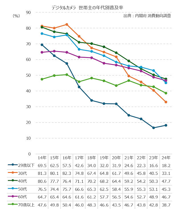 次に、内閣府の消費動向調査から、総世帯におけるデジタルカメラ普及率の推移をみる。14~16年までは6割台で推移、17年に58.9%と6割を下回った。その後も普及率は減少し続け、22年に5割を割り込み、24年は41.5%まで落ち込んでいる。直近10年で20ポイント以上の減少だ。