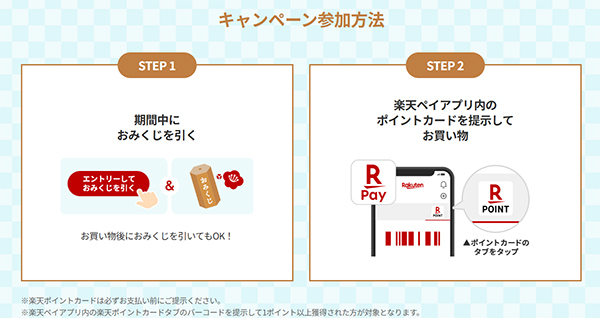 エントリーのうえ、キャンペーンページの「おみくじ」を引き、「楽天ペイ」アプリの「楽天ポイントカード」タブのバーコードを提示して1ポイント以上獲得した人はもれなく、「おみくじ」の結果に応じ、200ポイント・100ポイント・1ポイントのいずれかがもらえる。この条件1を達成したうえで、条件2「楽天ペイのコード決済で合計500円以上の支払い」または「楽天キャッシュを合計500円以上送付または受け取り」を達成した人から300人に1万ポイント、条件2のみ達成した人から抽選で1000人に楽天ポイント5000ポイントをプレゼントする。