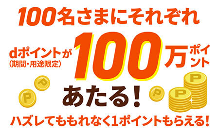 キャンペーンサイトからエントリーのうえ、アマゾンジャパンが提供する「Amazon.co.jp」上で「dアカウント」と「Amazonアカウント」を連携した人から、抽選で100人にdポイント(期間・用途限定)を1人あたり100万ポイントプレゼントする。キャンペーン開始前にアカウント連携済みの人も対象で、抽選にはずれても、もれなくdポイント(期間・用途限定)が1ポイントもらえる。