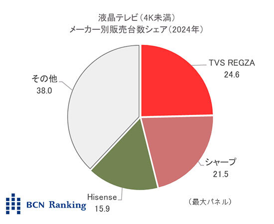 まず、液晶テレビ(4K未満)部門でAWARDを獲得したのはTVS REGZAだった。同社は2021年から4年連続でNo.1を獲得。メーカー別販売台数シェアは24.6%で、2位のシャープと3.1ポイントの僅差で激戦を制した。また、3位にはHisenseが15.9%でランクイン。昨年はTCL Corporationに及ばずTOP3入りを逃したが、2年ぶりに返り咲いた。