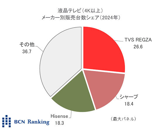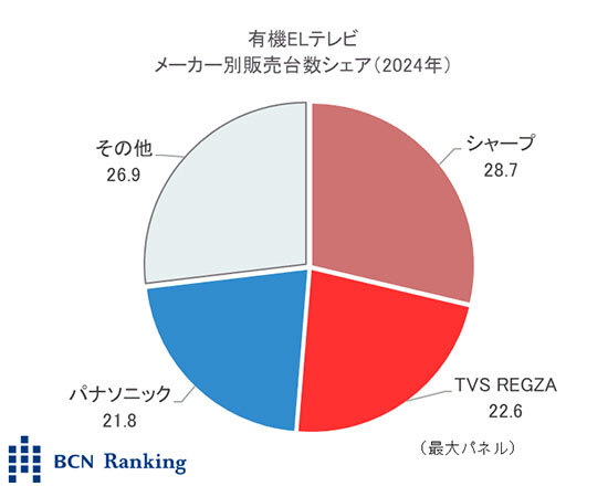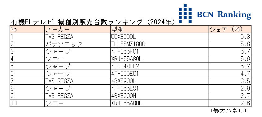 一方、シャープは55型や48型が主力。有機ELとしては小型の42型をラインアップしていることも支持の拡大に貢献した。24年全体の平均単価は19万1千円と、値ごろ感のある価格で販売台数を伸ばした。