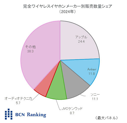 2024年の完全ワイヤレスイヤホン(TWS)市場でAnkerが11.8%の販売数量シェアを占め、初めて年間2位となった。アップルとソニーの二強体制が続いていたが、Ankerが割り込んだ形となった。