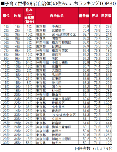 ちなみに「子育て世帯の街(自治体)の住みここち」1位は東京都中央区、2位は東京都武蔵野市、3位は埼玉県さいたま市浦和区、4位は千葉県浦安市、5位は神奈川県横浜市都筑区。評点はいずれも70台後半だった。