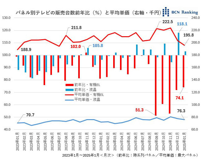有機ELテレビが苦戦している。液晶テレビは昨年6月以降、販売台数が前年を上回る場面が多くみられるようになってきた。しかし有機ELテレビは、直近で前年を上回ったのは一昨年11月の1度だけ。以降大幅な前年割れが続いている。全国2300店舗の家電量販店やオンラインショップの実売データを集計するBCNランキングで明らかになった。