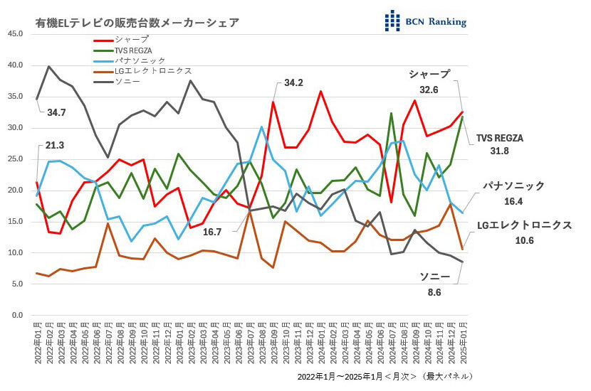 不調の一因は単価上昇に伴うソニーの低迷だ。特に23年7月、それまでおおむね30%台のシェアを維持してトップだったソニーが、16.7%まで急激にシェアを落とした。取って代わったのがシャープ。なかなか20%台を維持できず苦戦していたところから、23年9月には34.2%と急速にシェアを伸ばしてトップの座についた。シャープはこの1月も32.6%で首位を走っている。一方、かつてのトップメーカー、ソニーは8.6%にまでシェアを落とし主要5社の中では最下位に沈んだ。ソニーがシェアを失った大きな要因は平均単価(税抜き、以下同)の上昇だ。特に23年の動きが急だった。6月の22万9000円から、7月には一気に25万円台、8月には27万円台、9月には28万円台とどんどん上昇した。さらに昨年9月以降は30万円台で高止まりしている。一方シャープも徐々に単価が上昇しているものの、上げ幅は比較的僅か。そのため両社の価格差が開き、トップ交代劇に結び付いた。ソニーのテレビ全体に占める有機ELテレビの販売台数構成比も急速に縮小。それまで25~30%を占めていたが、昨年9月に8.8%と2桁割れ。以降ずっと1桁台で推移している。