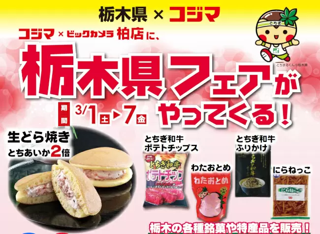 コジマは3月1~7日の期間、栃木県の特産品を取り揃えて販売する「栃木県フェア」を、「コジマ×ビックカメラ柏店」(千葉県柏市)にて開催する。