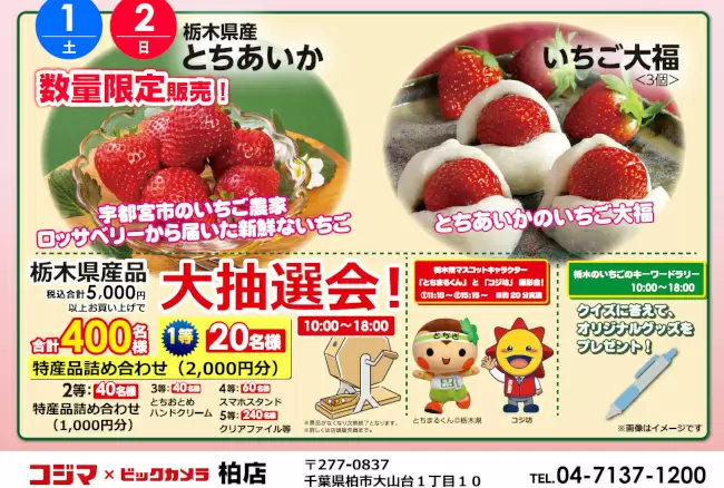 また、3月1日・2日にコジマ×ビックカメラ柏店で税込5000円以上を購入した人を対象に、2日間合計で先着400名(各日200名)に栃木県の名産品などが当たる、大抽選会を実施する。
