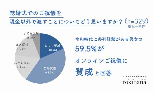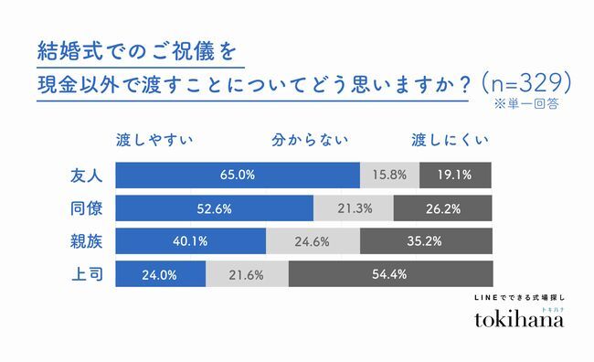 トキハナは3月26日に、令和時代に結婚式に参列した経験のある20~40代の男女を対象に実施した、結婚式のご祝儀事情に関する調査結果を発表した。同調査は、3月10~21日の期間に行われ、329名から有効回答を得ている。