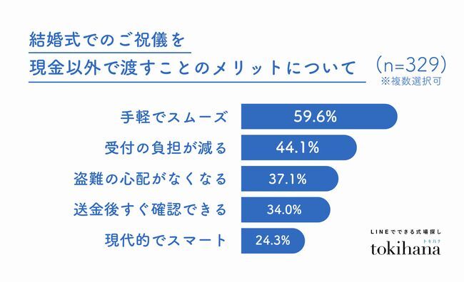 結婚式でのご祝儀を現金以外(キャッシュレス決済)で渡すことのメリットを尋ねたところ(複数回答)、「手軽でスムーズ」(59.6%)がもっとも多く、以下「受付の負担が減る」(44.1%)、「盗難の心配がなくなる」(37.1%)が続いている。