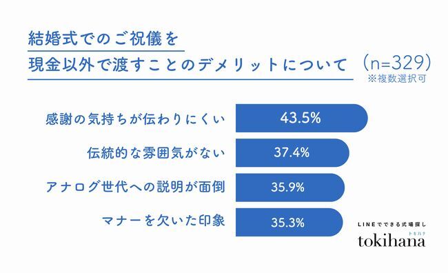 結婚式でのご祝儀を現金以外(キャッシュレス決済)で渡すことのデメリットを尋ねた質問(複数回答)では、「感謝の気持ちが伝わりにくい」(43.5%)、「伝統的な雰囲気がない」(37.4%)、「アナログ世代への説明が面倒」(35.9%)が上位を占めた。