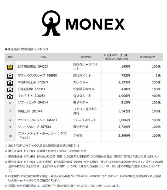サービス開始にあたり、マネックス証券では、「1株から積み立てできる銘柄」をランキング形式で紹介している。なお、単元未満株(ワン株)の積み立てを続けて100株以上を保有すると、株主優待として、例えば「日本電信電話(NTT)」は自社グループポイント、「ソフトバンク」は電子マネー(PayPayマネーライト)、オリエンタルランドは「1デーパスポート」を獲得できる。