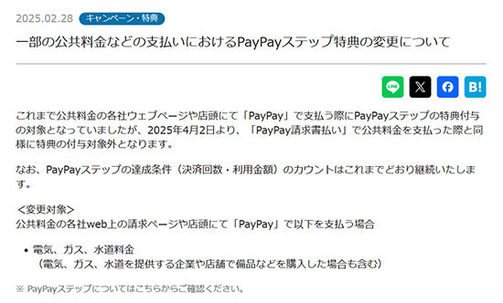 PayPayは、2025年4月2日から、一部の公共料金などの支払いについて、利用状況と支払い方法に応じてポイント還元率がアップする「PayPayステップ特典」の対象外に変更する。