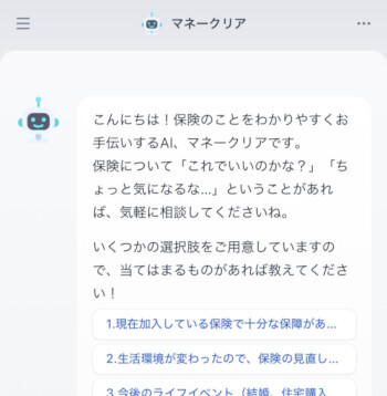 「マネークリア」は、AIとFP(ファイナンシャルプランナー)によるハイブリッド型保険相談サービスで、保険に関する疑問を整理して、納得感のある保険選びをサポートする。専門用語をわかりやすく解説して、不明点を明確に整理することによって、「自分に合った保険がわからない」「保障内容が難しくて理解できない」といった漠然とした不安の解消が可能になる。