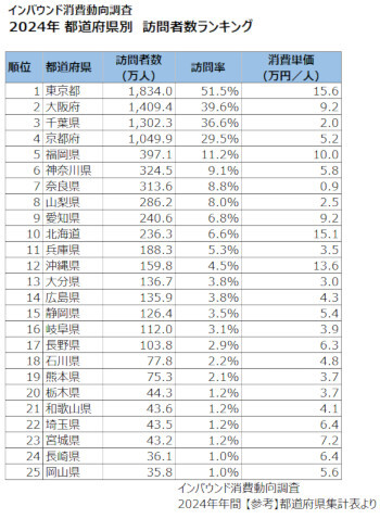 最新の2024年年間データによると、都道府県別訪問者数は、1位東京都(1834万人)、2位大阪府(1409万人)、3位千葉県(1302万人)、4位京都府(1050万人)、5位福岡県(397万人)でした。