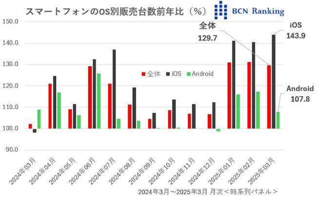 スマートフォン(スマホ)が売れている。販売台数前年比は、24年3月以降13カ月連続でプラス。特に今年に入ってからの伸びが大きく、おおむね30%の水準で伸びている。好調なのがiPhoneだ。1月以降の販売台数前年比は、いずれも40%を超える伸びを示している。全国2300店舗の家電量販店やネットショップの実売を集計する、BCNランキングで明らかになった。