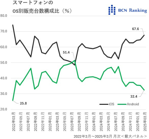 米・トランプ大統領が打ち出す新たな関税政策に、世界経済は翻弄されている。この影響で、中国で製造しているiPhoneの価格も跳ね上がるのではないか、とささやかれている。一部では4割以上値上がりするのではと危惧する声もあるようだ。実際はどれくらいの影響があるのか、日本での売価がどれほど上昇するのかは不透明。しかし今後、駆け込み購入が生じるようなことがあれば、iPhoneのシェアは一時的に7割を超える場面があるかもしれない。(BCN・道越一郎)