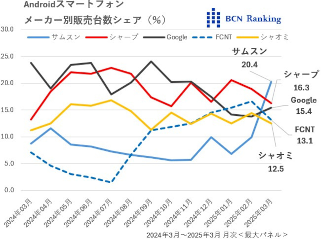 Android勢はiPhoneに押されて後退している。OS別の販売台数構成比ではこの3月、iOSが67.6%と7割弱を占め圧倒的。Androidは32.4%と、ここ3年で最低だった、22年3月の25.8%に迫る縮小ぶりだ。Androidスマホは23年8月、Google Pixelが好調で51.4%の販売台数シェアを記録。iPhoneを上回った。しかしこれは「一月天下」に終わりすぐにiOSがシェアを奪還。以降安定的にトップシェアを維持している。昨年9月以降は特に好調で、7カ月連続でシェア6割超だ。どんぐりの背比べのようなAndroid勢では、Googleとシャープでトップ争いをする中、シャオミが絡むという構図が続いていた。しかし上位2社がシェアを落とす中で、混戦状態に突入。現在の注目はサムスンだ。2月に発売したばかりの廉価モデル「Galaxy A25 5G」の出足が好調。上位陣では唯一シェアが右肩上がりだ。ここしばらく息をひそめていた感のある同社だが、3月は20.4%とAndroidスマホでトップシェアを獲得。これは22年2月以来丸3年と1カ月ぶりだ。
