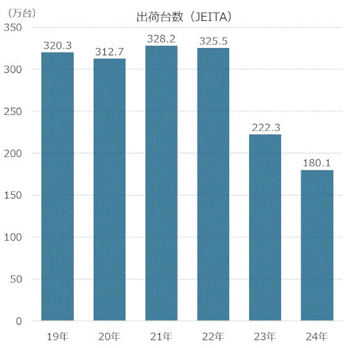 電子情報技術産業協会(JEITA)の統計によると、2023年以降インクジェットプリンターの出荷台数が急減していることが明らかになった。また、BCNランキングによると、インクジェットプリンターは毎年12月に販売台数を多く稼いでいることが分かった。