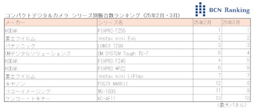 2025年3月のコンパクトデジタルカメラ(コンデジ) シリーズ別販売台数ランキングで、パナソニックの「LUMIX TZ99」が3位にランクインした。家電量販店・ネットショップの実売データを集計する「BCNランキング」から25年3月のコンデジ市場を振り返る。