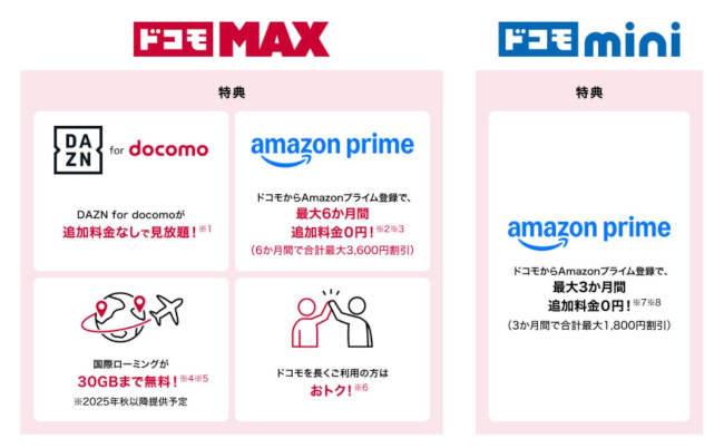 別途、「ドコモ ポイ活 MAX」と「ドコモ ポイ活 20」は、特典として、対象となる決済の利用に応じ、dポイント(期間・用途限定)で最大5000ポイントまたは最大2500ポイントの還元と、マネックス証券でのdカード積立に対する特典(dカード PLATINUM/dカード GOLD/dカード GOLD Uのみ、進呈上限1000ポイント)を受けられる。このほか、「ドコモ MAX」と「ドコモ ポイ活 MAX」は30GBまでの国際ローミング無料特典(2025年9月以降提供開始)が付く。