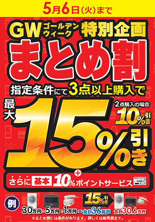 GWまとめ割では、ビックカメラ各店とインターネット総合通販サイト「ビックカメラ・ドットコム」で、4月26日から5月6日の間に、指定金額以上の同社指定メーカーの商品を2点以上同時購入で10%引き、3点以上同時購入で15%引きで販売する。対象メーカーは、日立、ダイキン、富士通ゼネラル、象印、タイガー、アクア、シャーク、シャークニンジャ、エコバックス、サーモス、ヤーマン、ブラウン、KINUJO、サロニア、オムロン、マイトレックス、TCL、JBL、オーディオテクニカ、ローランド。なお、富士通ゼネラルのみ4月26日から29日までとなる。