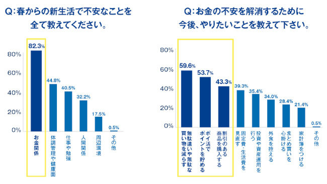 調査対象者に、春からの新生活で不安なことを尋ねたところ(複数回答)、「お金関係(生活費や家計のやりくり)」(82.3%)がもっとも多く、「仕事や勉強」(40.5%)や「人間関係」(32.2%)と比較して2倍以上の差を付けた。お金の不安を解消するために、今後やりたいこととしては(複数回答)、「無駄遣いや無駄な買い物を減らす」(59.6%)が最多となり、以下「ポイ活でポイントを貯める」(53.7%)、「割引のある商品を購入する」(43.3%)が続いている。
