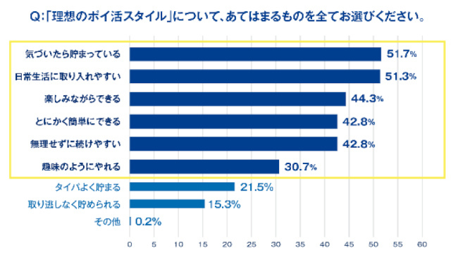「理想のポイ活」について、当てはまるものを選んでもらった質問(複数回答)では、「気づいたら貯まっている」(51.7%)、「日常生活に取り入れやすい」(51.3%)が半数超で上位を占め、「楽しみながらできる」(44.3%)」がそれに続いた。また、「とにかく簡単にできる」「無理せず続けやすい」「趣味のようにやれる」が、いずれも3割超で上位にランクインしている。