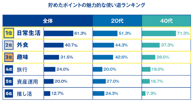 貯めたポイントの使い道としては、「日常生活」(61.3%)がもっとも多かったものの、年代別でみると20代では「日常生活」(51.3%)が全体よりもマイナス10ポイントだったのに対して、「外食」(44.3%)、「趣味」(42.6%)、「旅行」(27.0%)、「推し活」(24.3%)は全体を上回った。中でも「趣味」(42.6%)は、全体を11.1ポイント上回り、「旅行」(27.0%)は全世代の中で最多となっている。