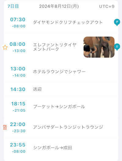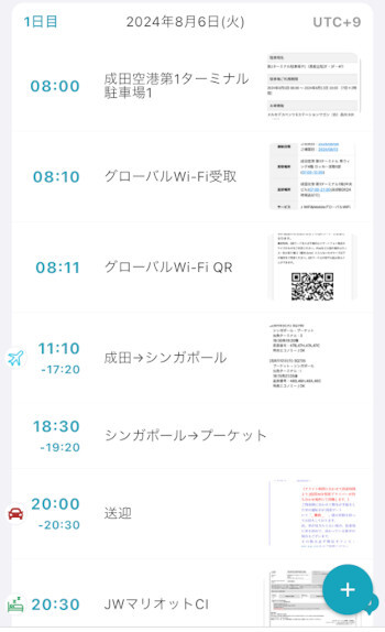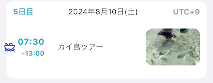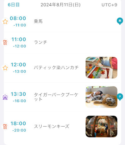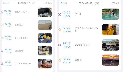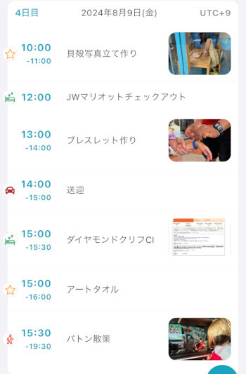 また、過去の旅のしおりも保存されるので、後から思い出として見返すこともできます。予定に合わせて開始や終了時間を設定でき、登録した画像を一覧で見ることもできます。