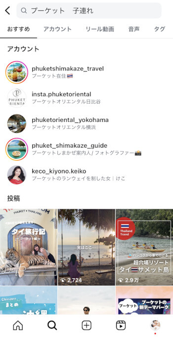 Instagramの検索タブで「プーケット 子連れ」「プーケット 体験」「#子連れプーケット」など、調べたいキーワードを入力して情報を収集します。(1)(2)で調べた情報を基に、現地に住んでいる子持ち家庭のSNSやブログをチェックしたり、地元の人が訪れる子連れスポットをリサーチしたり、ホテルを選んだりしました。なるべく現地の文化を地元目線で見たいという私の妙なこだわりが発動した結果です。