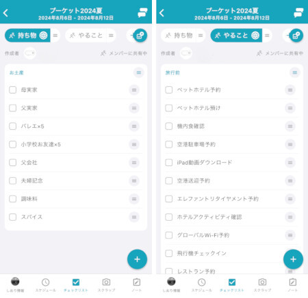 チェックリストでは、持ち物を、すること別に入力できるので、旅行中のお土産リストとしても使えます。