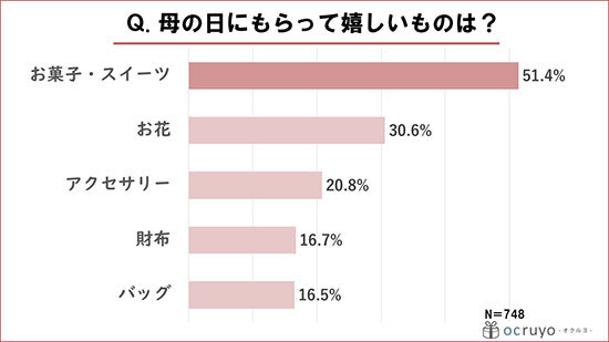 あわせて女性748名に、母の日にもらってうれしいプレゼントを尋ねた質問(複数回答)では、「お菓子・スイーツ」(51.4%)が最多となり、以下「お花」(30.6%)、「アクセサリ」(20.8%)が続いている。