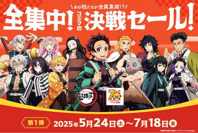 コジマは5月24日~7月18日の期間、創業70周年特別企画として、アニメ「鬼滅の刃」との限定コラボグッズのプレゼントや、楽しい企画を数多く用意した「全集中!コジマの決戦セール!」を、全国の「コジマ」店舗およびオンラインショップの「コジマネット」にて開催する。