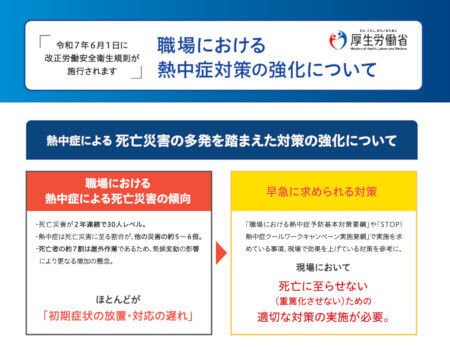 熱中症のおそれのある人への処置の例などは、厚労省の「職場における熱中症対策の強化について」(https://www.mhlw.go.jp/content/001476821.pdf)に詳しく示されているので、自社における熱中症対策づくりの参考にしてほしい。