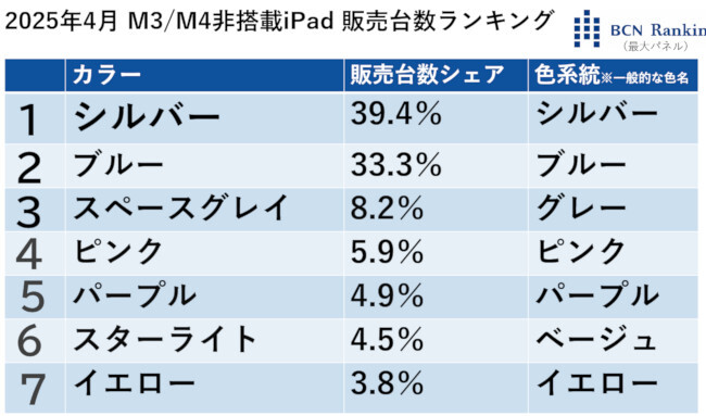 全国の主要家電量販店・ネットショップの実売データを集計した「BCNランキング」の2025年4月の月次集計によると、M4/M3非搭載のiPadのカラー別販売台数1位は「シルバー」、2位は「ブルー」、3位は「スペースグレイ」でした。販売中のiPadはモデルごとにカラーバリエーションが異なり、4位の「ピンク」や7位の「イエロー」は、最も価格が手ごろなiPadのみのカラーです。