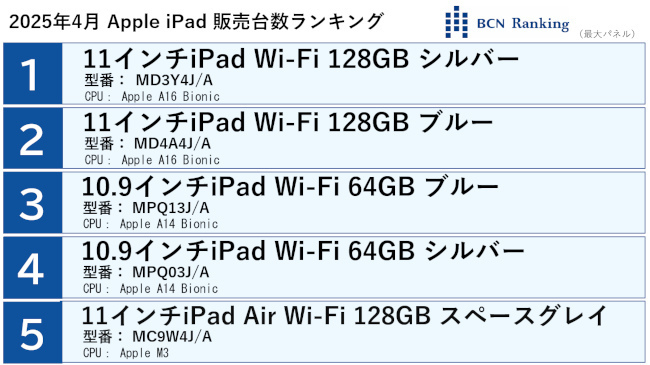またカラー・容量ごとにカウントする機種別集計で、25年4月に最も売れたiPadはApple A16 Bionicを搭載した「11インチiPad Wi-Fi 128GB シルバー(MD3Y4J/A)」(25年3月発売)でした。