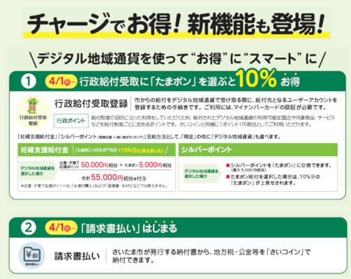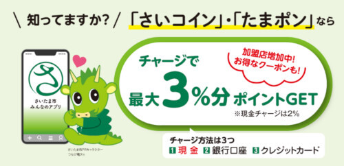 さいコインとは、アプリ内でチャージして使える地域限定の電子マネーであり、さいたま市内の加盟店や公共料金の支払いに利用できる。銀行口座や対象のクレジットカード、指定の銀行ATMからチャージ可能で、使用額に応じて「たまポン」というポイント(最終付与または最終利用日から180日間有効)も付与される仕組み。さらに2025年度中はチャージするといつでも金額3%分の「たまポン」がもらえる。